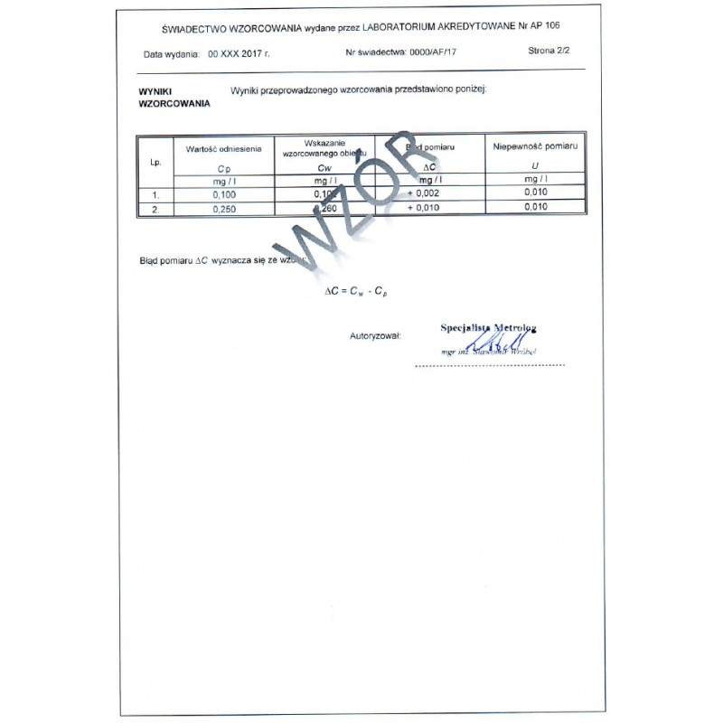 - dokument potwierdzający kalibrację urządzenia