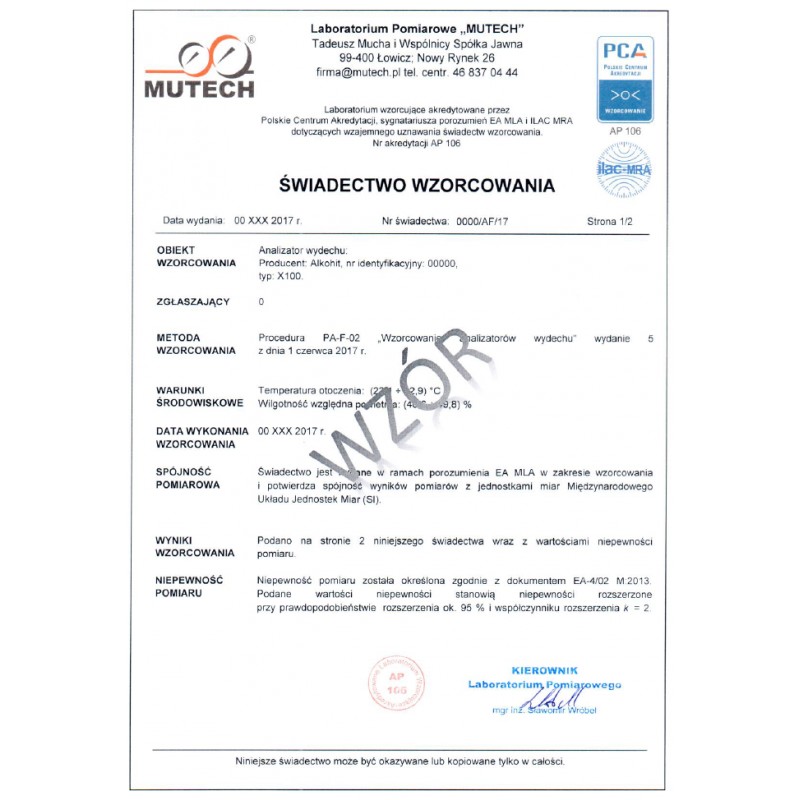 X100 należy do rodziny alkomatów dowodowych może otrzymać świadectwo wzorcowania (dawną legalizację)